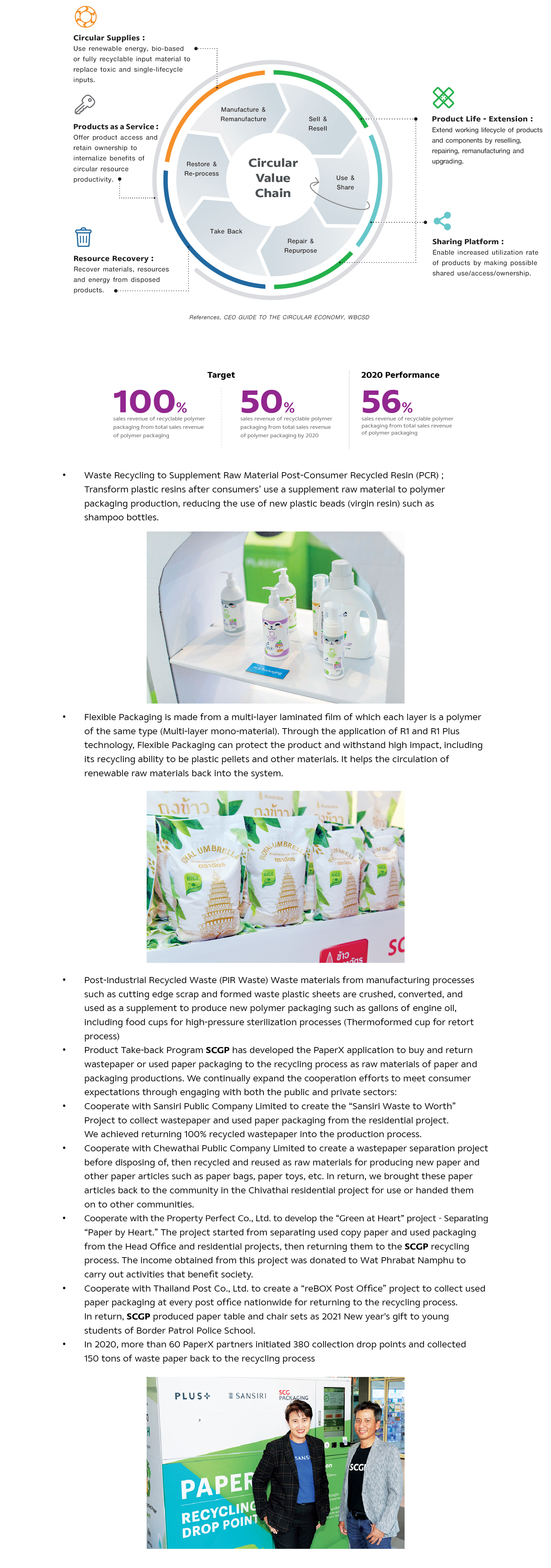 SCGP places great emphasis towards Circular Economy as an essential solution to Thailand and the global environmental issues such as global warming, resource scarcity, global waste crisis, poverty, and quality of life. By elevating our Circular Economic practices, we are able to manage the circulation of resources and energy in the system with cost-effectiveness at the highest benefit, starting from planning, design, material selection, production, consumption, and waste management until recycling in the production process as raw materials.