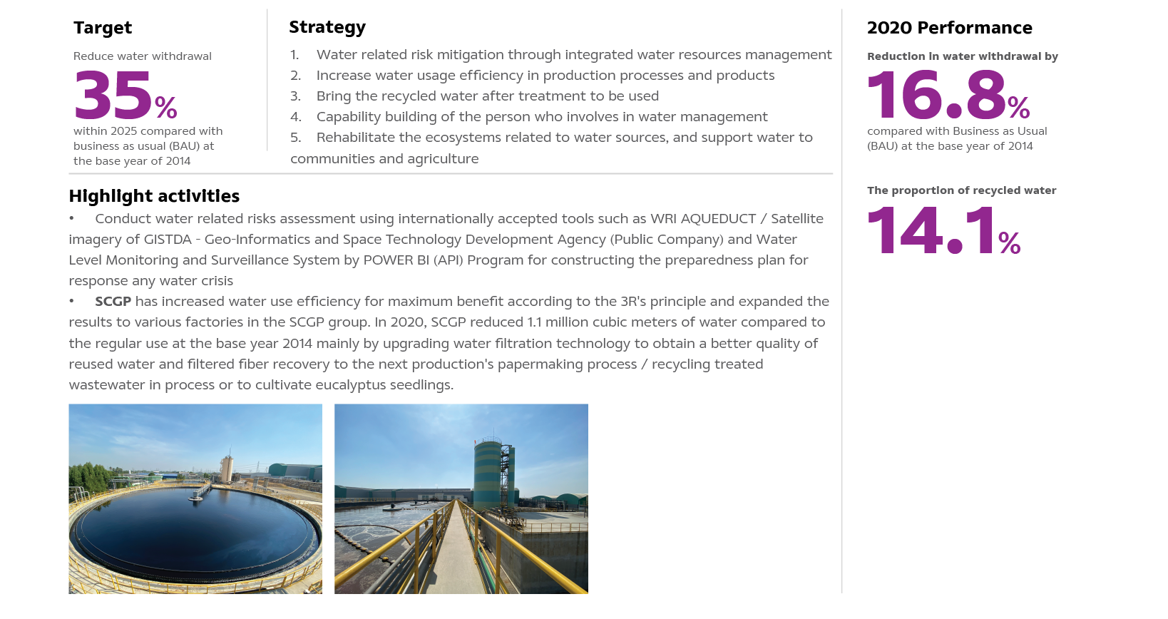 Climate change is a volatile challenge that directly impacts water resource management every year. Examples are unseasonal and erratic rainfall patterns, no rains at the headwater area, and droughts, depleted water volume in dams. Moreover, the increasing future demand for water consumption in all geographical areas and sectors creates a risk of water shortage in the manufacturing process, which might cause water usage conflicts with other sectors. SCGP, therefore, leverages the capability to manage integrated water resource management with government and industrial sectors. Efforts include developing water storage facilities within the factory area, Increasing water usage efficiency, and using recycled water after treatment following the 3R's principle.