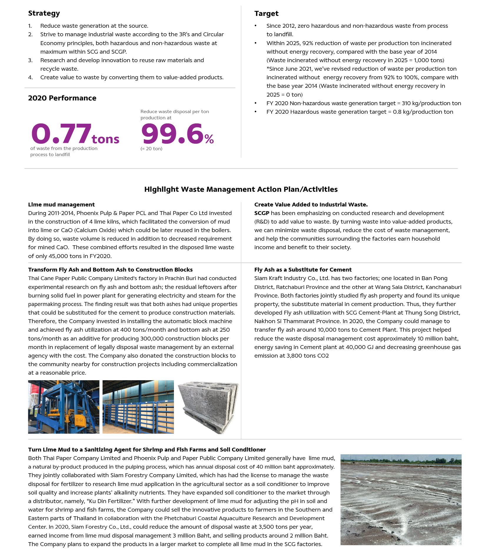 SCGP manages elimination of pollutants, and industrial waste according to 3R's (Reduce, Reuse, Recycle) and Circular Economy principles. We continuously improve, upgrade the production process and develop research and innovation to maximize pollutants and waste reductions throughout the supply chain. We also recycle the production waste as raw materials and waste-to-alternative fuel, also convert to value-added products. Therefore, we can reduce the use of raw materials from natural resources and minimize the impacts on the environment and society.