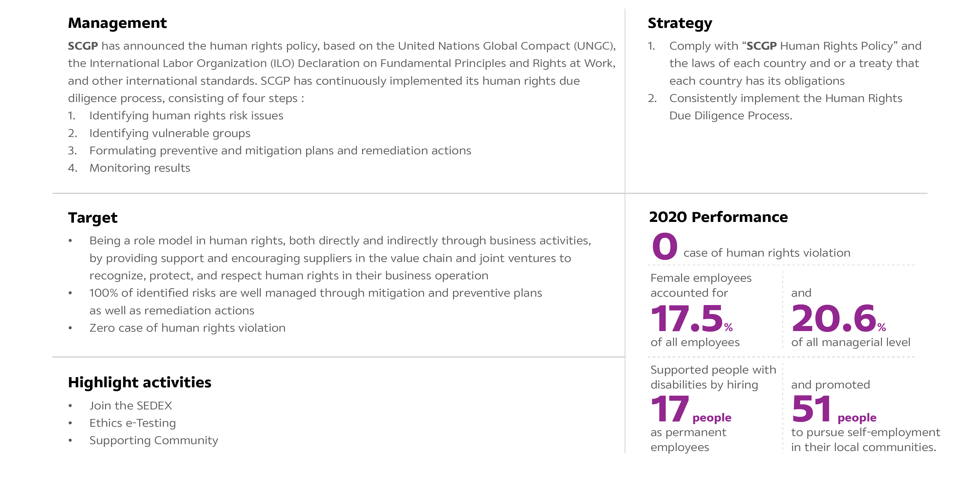 SCGP places the most importance on human rights practices across the supply chain to ensure that all stakeholders are treated equitably, fairly, and with dignity and respect in accordance with the Universal Declaration of Human Rights (UDHR), the United Nations Global Compact(UNGC), the United Nations Guiding Principles on Business and Human Rights (UNGP), the International Labor Organization (ILO) Declaration on Fundamental Principles and Rights at Work, and SCG Human Rights Policy.